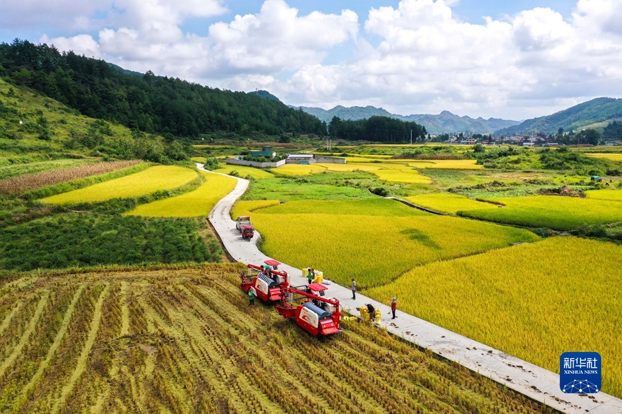2021年9月15日,貴州省龍里縣灣灘河鎮(zhèn)羊場社區(qū)的農(nóng)民在搶收稻谷(無人機(jī)照片)。 新華社記者 楊文斌 攝
