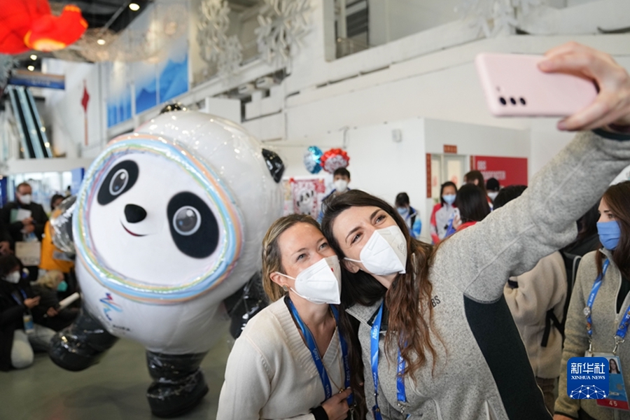 2月12日,北京冬奧會主媒體中心舉辦集體采訪活動(dòng),現(xiàn)場觀眾與北京2022年冬奧會吉祥物“冰墩墩”自拍留念。 新華社記者 鞠煥宗 攝
