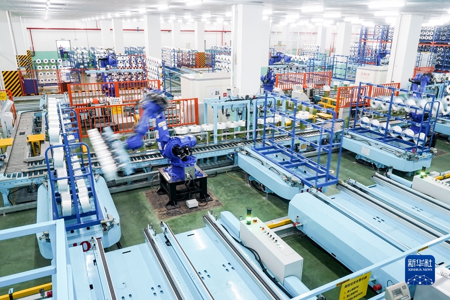 2021年5月14日,在位于江蘇省蘇州市吳江區(qū)盛澤鎮(zhèn)的一家智能車間,機(jī)器人在車間內(nèi)自動(dòng)作業(yè)。新華社記者 李博 攝