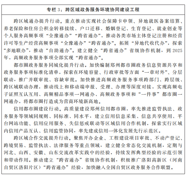 政務(wù)服務(wù)效能走在全國前列。審批服務(wù)便民化改革深入推進(jìn),審批流程持續(xù)優(yōu)化。政務(wù)服務(wù)線上線下融合互通、跨層級(jí)跨地區(qū)跨部門協(xié)同辦理水平不斷提高,“全省通辦”“豫事快辦”“跨省通辦”場景應(yīng)用領(lǐng)域全國領(lǐng)先。政企溝通渠道愈加暢通,“親”“清”新型政商關(guān)系全面形成。力爭實(shí)現(xiàn)政務(wù)服務(wù)大廳綜合窗口全覆蓋,同類審批服務(wù)事項(xiàng)辦理效率全國領(lǐng)先。