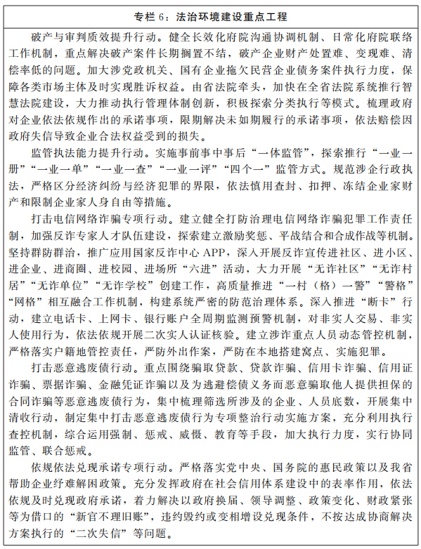 嚴(yán)格執(zhí)行保護(hù)企業(yè)產(chǎn)權(quán)的司法政策,合理劃定責(zé)任財(cái)產(chǎn)范圍,重點(diǎn)解決國有資產(chǎn)流失、利用公權(quán)力侵害私有產(chǎn)權(quán)等產(chǎn)權(quán)保護(hù)中的突出問題。嚴(yán)格區(qū)分經(jīng)濟(jì)糾紛與經(jīng)濟(jì)犯罪,依法慎用刑事強(qiáng)制措施,嚴(yán)格規(guī)范涉案企業(yè)財(cái)產(chǎn)的保全和處置措施。依法平等保護(hù)各類市場主體,對企業(yè)負(fù)責(zé)人少捕慎訴慎押。健全涉企產(chǎn)權(quán)冤錯(cuò)案件有效防范和常態(tài)化糾錯(cuò)機(jī)制,加大企業(yè)產(chǎn)權(quán)冤錯(cuò)案件賠償決定執(zhí)行力度。強(qiáng)化善意文明執(zhí)行理念,嚴(yán)禁超標(biāo)的查封、亂查封,建立健全查封財(cái)產(chǎn)融資償債和自行處置機(jī)制。加強(qiáng)數(shù)字貨幣、網(wǎng)絡(luò)虛擬財(cái)產(chǎn)、數(shù)據(jù)等新型權(quán)益保護(hù)。依法保護(hù)股東特別是中小股東的知情權(quán)、參與權(quán)、收益權(quán)、求償權(quán)等合法權(quán)利。暢通投資者維權(quán)渠道,推動(dòng)加強(qiáng)在線咨詢等工作,加快投資者維權(quán)從“線下跑”向“網(wǎng)上辦”轉(zhuǎn)變。強(qiáng)化上市公司監(jiān)管,提高上市公司透明度。全面開展打擊電信網(wǎng)絡(luò)詐騙專項(xiàng)行動(dòng),聚焦“抓防范、強(qiáng)治理、降發(fā)案”,升級(jí)完善省、市、縣三級(jí)反詐中心,注重縣域高發(fā)類案件和大要案件集中攻堅(jiān)的資源技術(shù)支撐,著力構(gòu)建誠信社會(huì)環(huán)境。全面開展打擊惡意逃廢債專項(xiàng)行動(dòng),重點(diǎn)打擊騙取貸款、金融憑證詐騙、拒不履行法院判決裁定等違法犯罪行為,努力營造良好金融生態(tài)。全面開展依規(guī)依法兌現(xiàn)承諾專項(xiàng)行動(dòng),嚴(yán)格落實(shí)惠民政策和幫助企業(yè)紓難解困政策,建立健全“政府承諾+社會(huì)監(jiān)督+失信問責(zé)”機(jī)制,重點(diǎn)整治“新官不理舊賬”等政務(wù)失信問題。