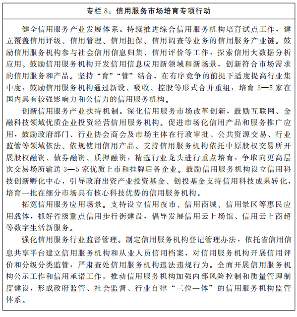 加速培育壯大一批具有較強(qiáng)市場公信力和影響力的信用服務(wù)機(jī)構(gòu),打造一批特色鮮明、相對集聚的信用服務(wù)產(chǎn)業(yè)園區(qū),形成強(qiáng)大的信用生態(tài)鏈。加強(qiáng)信用服務(wù)機(jī)構(gòu)引進(jìn)來和“走出去”,引進(jìn)國內(nèi)外知名信用服務(wù)機(jī)構(gòu),設(shè)立省級(jí)征信公司,鼓勵(lì)省內(nèi)信用服務(wù)機(jī)構(gòu)參與國內(nèi)跨區(qū)域信用合作和國際競爭,增加高水平信用服務(wù)供給,提升信用服務(wù)機(jī)構(gòu)規(guī)模優(yōu)勢。