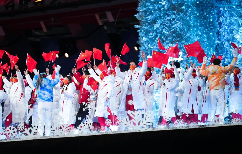 2月20日晚,中國代表團成員在北京第二十四屆冬季奧林匹克運動會閉幕式中入場。新華社記者鞠煥宗攝