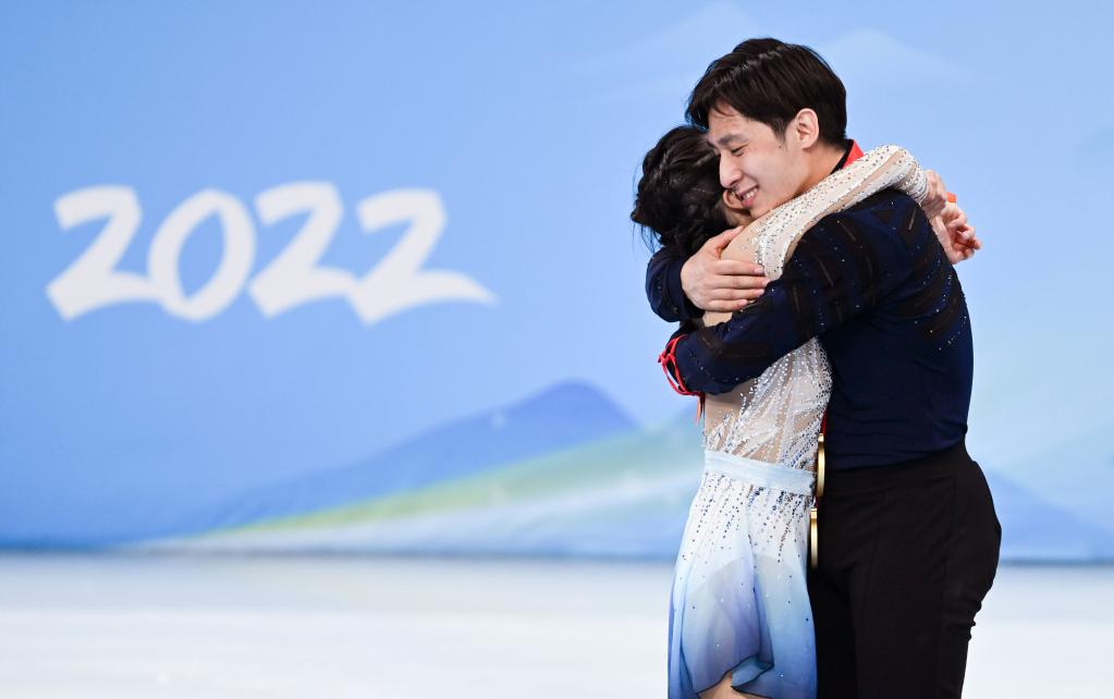 2月19日,隋文靜/韓聰(右)在獎牌頒發(fā)儀式上。新華社記者李尕攝