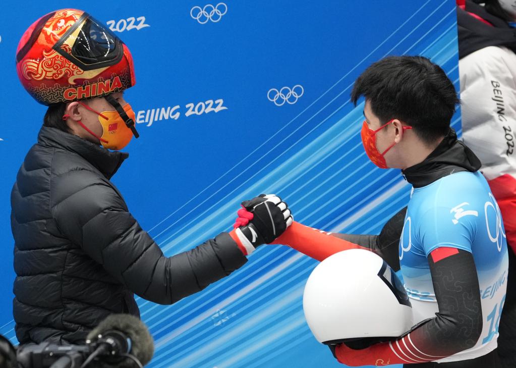 2月11日,閆文港(右)在國家雪車雪橇中心舉行的北京2022年冬奧會男子鋼架雪車比賽后和隊友殷正握手。新華社記者孫非攝