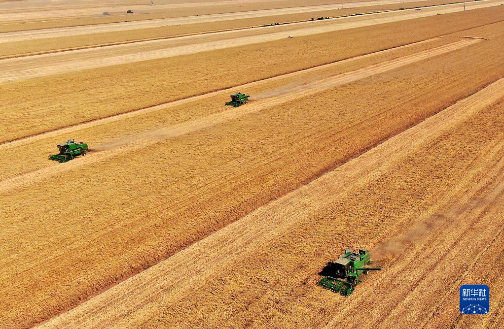 在河南省黃泛區(qū)農(nóng)場九分場的麥田里,農(nóng)機手操作收割機收獲小麥(無人機照片,2021年6月6日攝)。新華社記者 李安 攝
