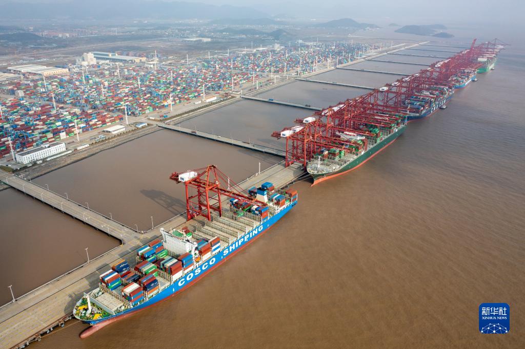 浙江寧波舟山港梅山港區(qū)集裝箱碼頭一派繁忙景象(2021年12月17日攝,無人機照片)。新華社發(fā)(蔣曉東 攝)