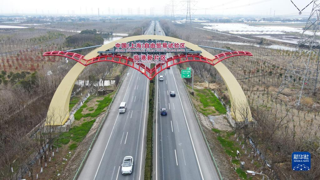 這是2022年2月10日拍攝的S2滬蘆高速上的中國(guó)(上海)自由貿(mào)易試驗(yàn)區(qū)臨港新片區(qū)“海鷗門”(無(wú)人機(jī)照片)。新華社記者 方喆 攝