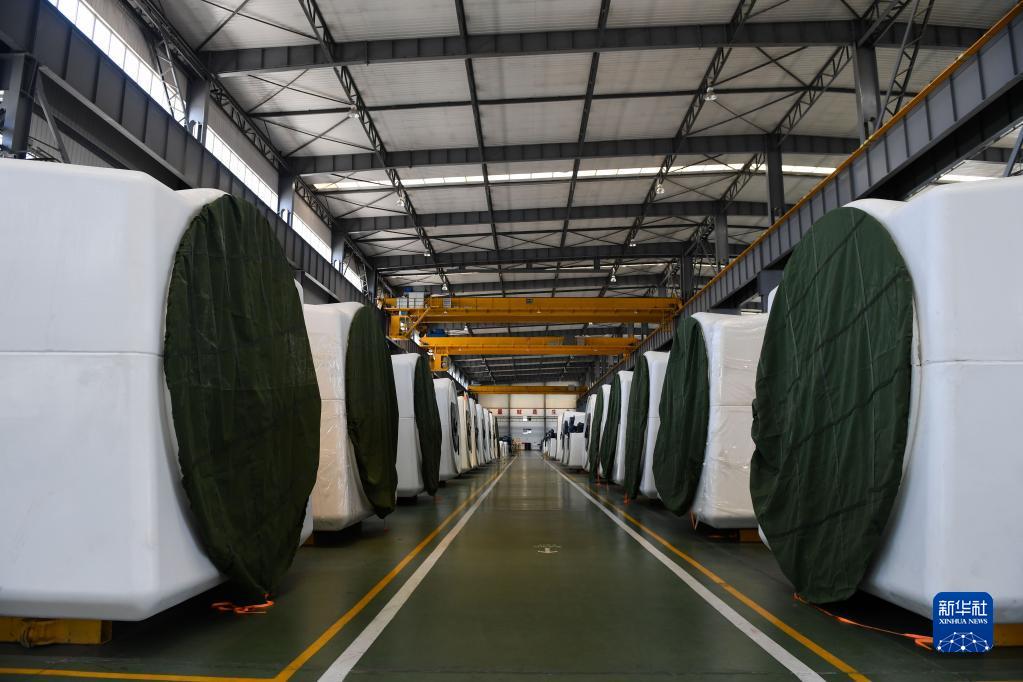 這是在內(nèi)蒙古鄂爾多斯市一家能源裝備有限公司生產(chǎn)車間拍攝的準(zhǔn)備出售的風(fēng)電機(2018年4月18日攝)。新華社記者 劉磊 攝