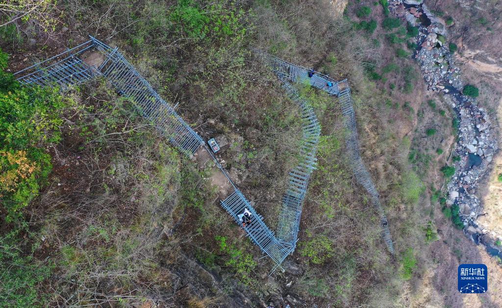在四川涼山彝族自治州昭覺縣阿土列爾村的懸崖鋼梯上,“懸崖村”村民沿著鋼梯下山(2020年5月13日攝,無人機照片)。新華社記者 王曦 攝