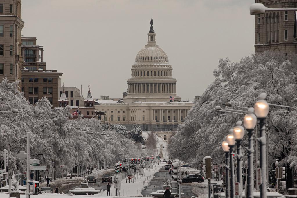 這是1月3日在美國(guó)首都華盛頓拍攝的雪后的國(guó)會(huì)大廈。新華社發(fā)(阿倫攝)