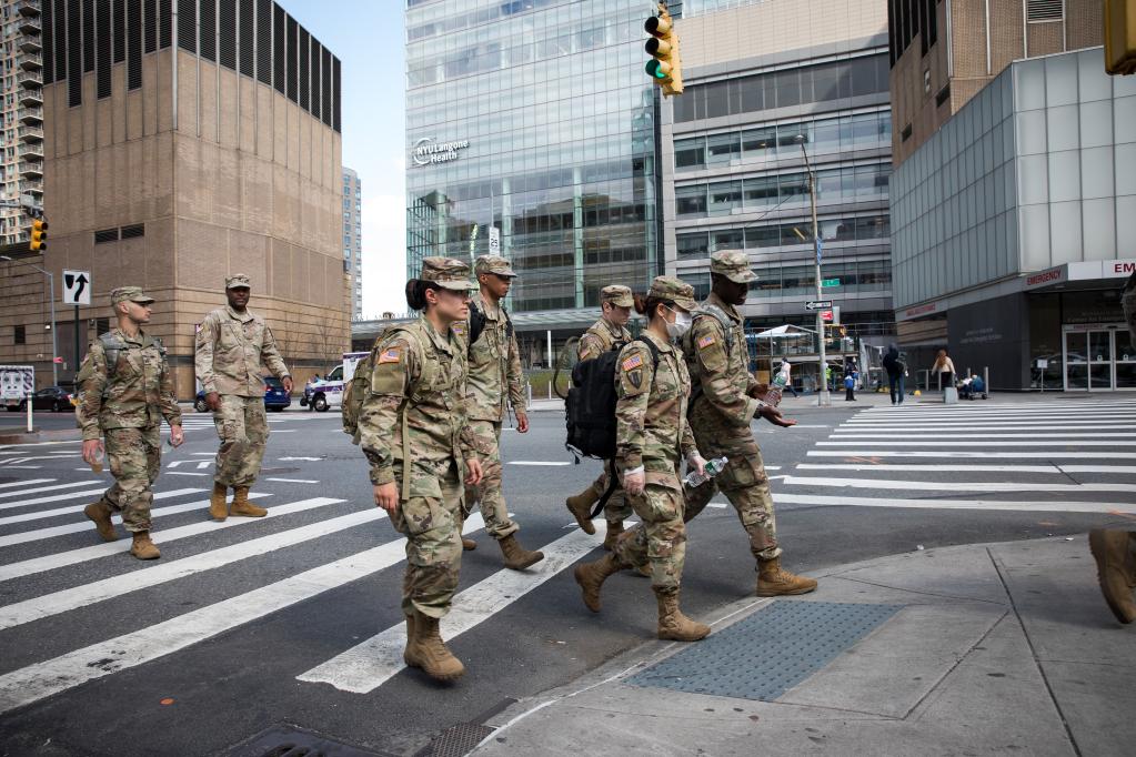 2020年4月8日,在美國(guó)紐約,美軍士兵從一家醫(yī)院外走過(guò)。新華社發(fā) (郭克攝)
