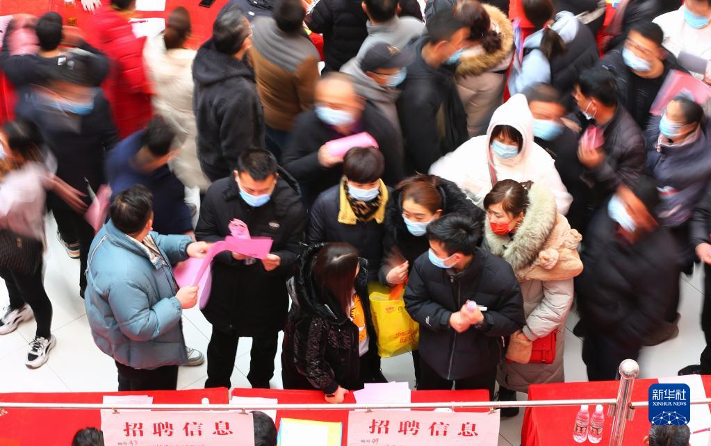 求職人員在山東省滕州市“春風(fēng)送崗”春季人才招聘會(huì)上尋找就業(yè)崗位(2022年2月19日攝)。 新華社發(fā)(李志軍 攝)