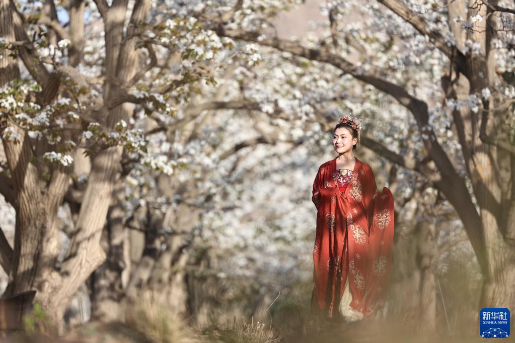 4月7日,景區(qū)工作人員在甘肅省蘭州市皋蘭縣什川鎮(zhèn)百年梨園內(nèi)進(jìn)行表演。受疫情影響,景區(qū)組織工作人員在梨園內(nèi)直播,邀請人們“云賞花”,滿足公眾賞花需求。新華社記者 陳斌 攝