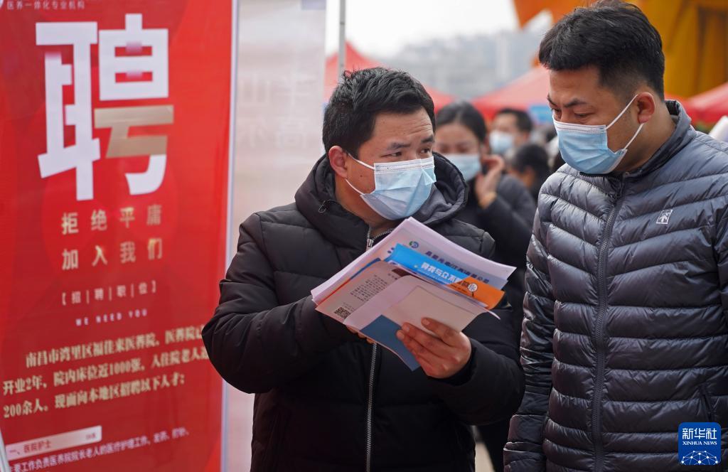 2月25日,江西省南昌市灣里管理局開展“春風(fēng)行動”線下招聘活動。這是求職者在招聘會現(xiàn)場交流。新華社記者 萬象 攝