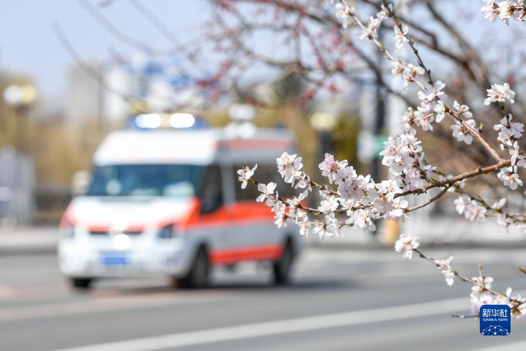 4月14日,一輛救護(hù)車(chē)在吉林市松江東路上駛過(guò),路邊桃花已經(jīng)盛開(kāi)。新華社記者 張楠 攝