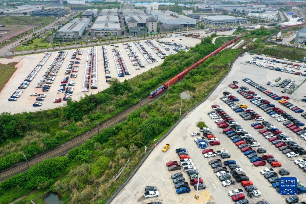 4月14日,長(zhǎng)城汽車(chē)專(zhuān)列首發(fā)列車(chē)行駛在重慶永川國(guó)家高新區(qū)鐵路專(zhuān)用線上(無(wú)人機(jī)照片)。新華社記者 唐奕 攝