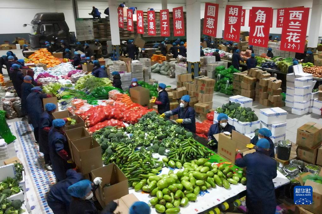 吉林省梅河口市工作人員進(jìn)行“蔬菜包”菜品分揀(4月7日攝,無(wú)人機(jī)照片)。新華社發(fā)