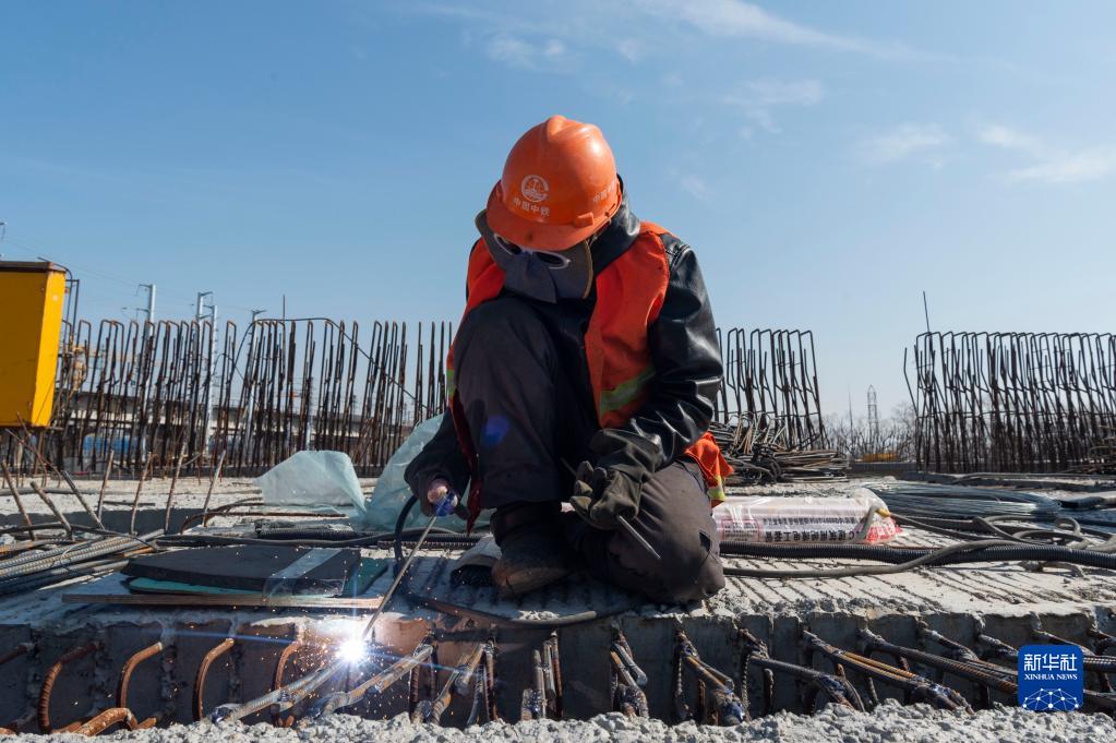 4月3日,在哈爾濱市道外區(qū),工人在中鐵一局北門(mén)街高架工程施工現(xiàn)場(chǎng)作業(yè)。新華社記者 謝劍飛 攝