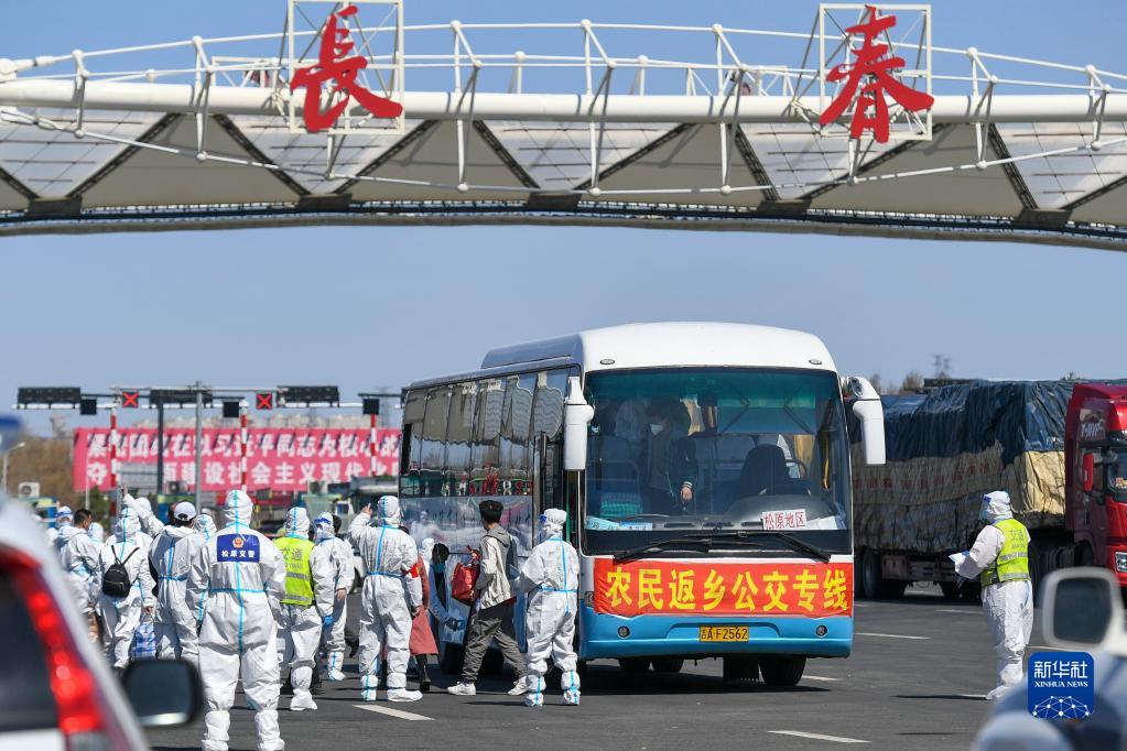 在吉林長(zhǎng)春高速公路東出口,返鄉(xiāng)農(nóng)民登上返鄉(xiāng)公交專(zhuān)線(4月12日攝)。新華社發(fā)