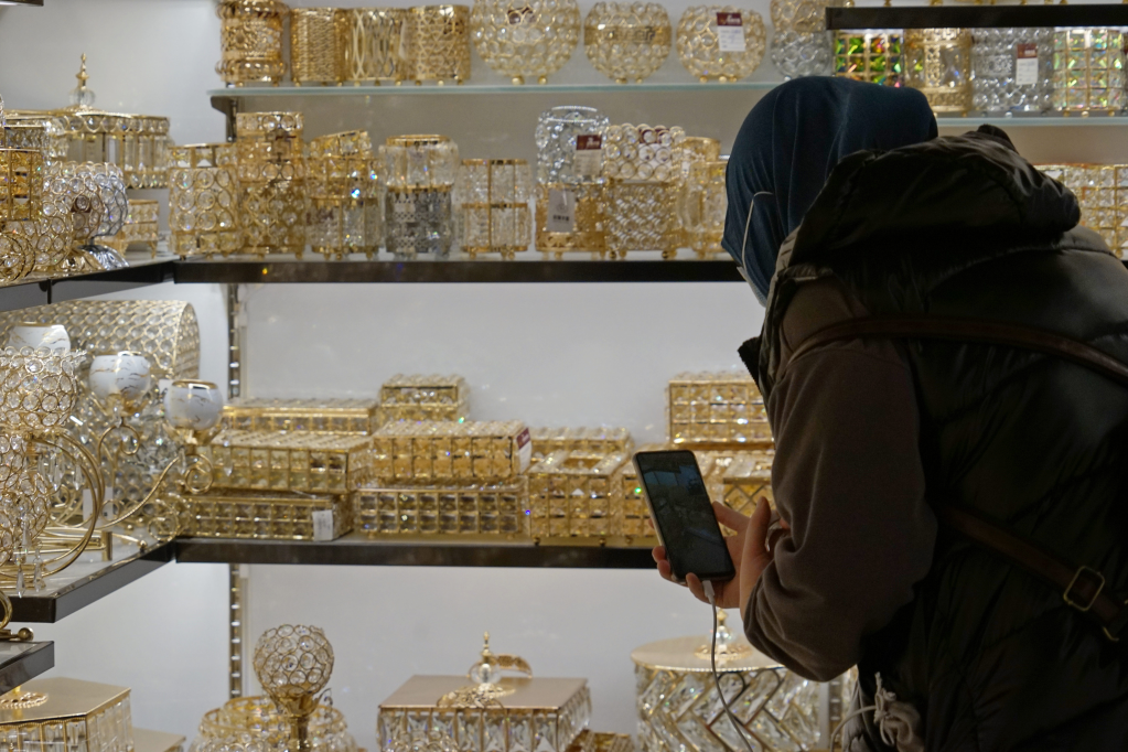 義烏國際商貿(mào)城一家水晶商鋪內(nèi),業(yè)務(wù)員小丁正在貨架前進(jìn)行遠(yuǎn)程視頻連線,手機(jī)的另一頭連著巴勒斯坦。受疫情影響,海外客商來華不便,遠(yuǎn)程直播成為其采購之“眼睛”。“客戶擔(dān)心這個(gè)燈臺尺寸比較大,運(yùn)費(fèi)會不會比較貴?”業(yè)務(wù)員小丁問?!皼]問題,主體和燈座可以拆卸,包裝不占空間?!鄙啼佖?fù)責(zé)人劉榮斌立即回復(fù)。