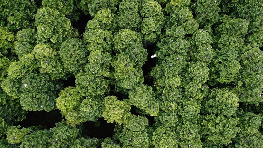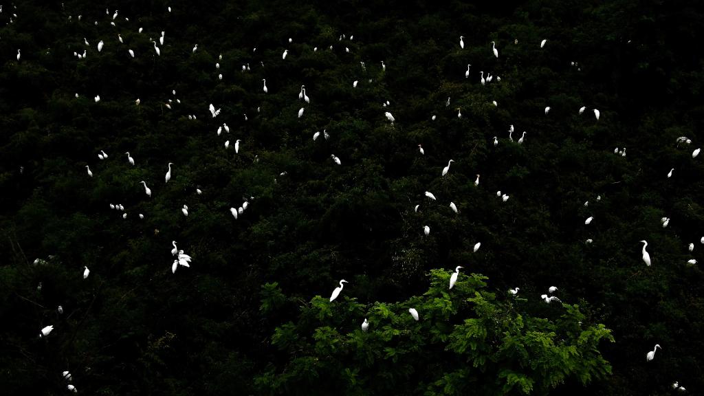 在江蘇省大豐麋鹿國家級自然保護區(qū),大量白鷺在樹頂棲息。(無人機拍攝)新華社記者李響攝