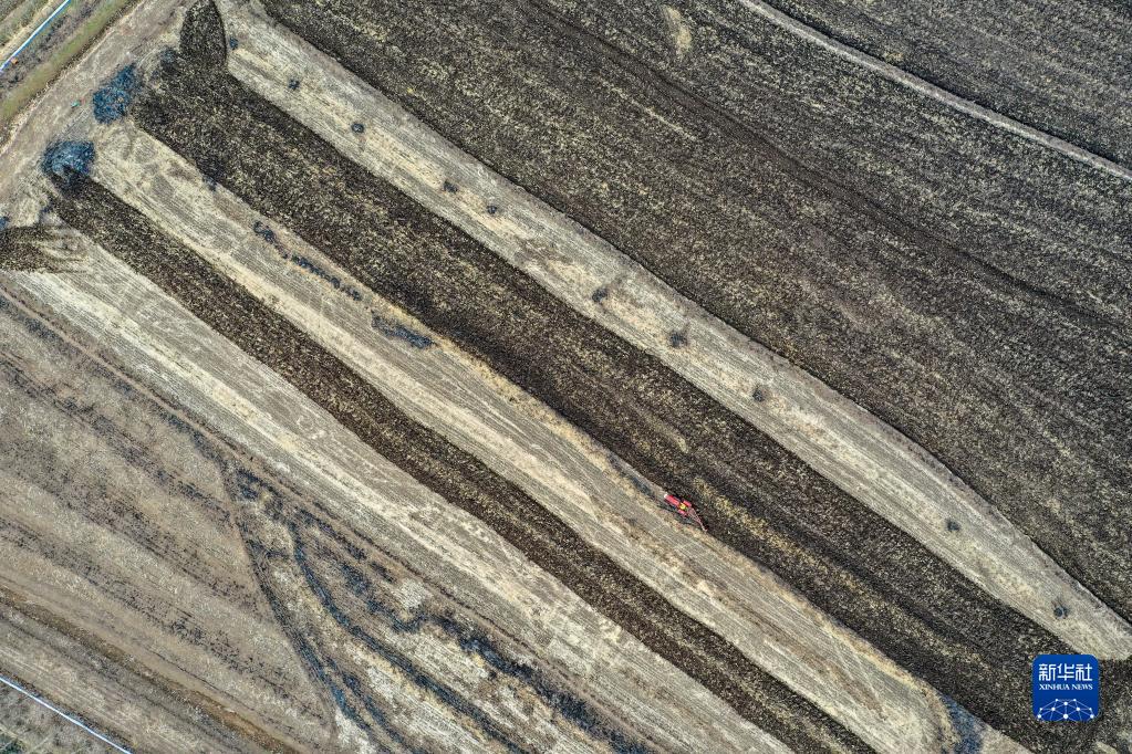 在吉林省吉林市昌邑區(qū)孤店子鎮(zhèn)紅衛(wèi)村,春新生態(tài)家庭農(nóng)場(chǎng)農(nóng)民駕駛農(nóng)機(jī)耕地(4月26日攝,無人機(jī)照片)。新華社記者 張楠 攝