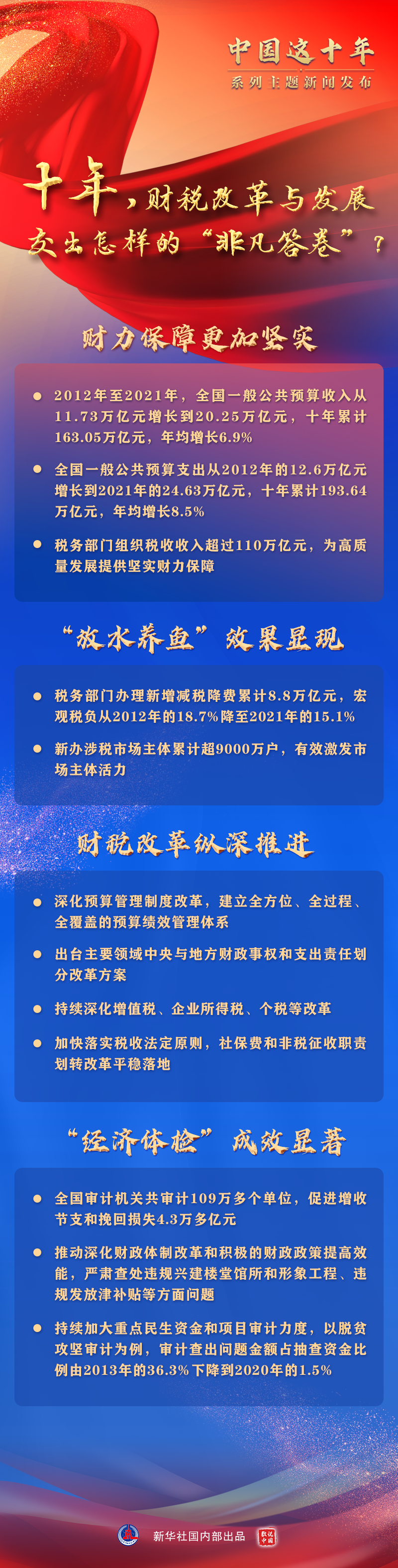 深化預(yù)算管理制度改革,建立全方位、全過(guò)程、全覆蓋的預(yù)算績(jī)效管理體系;出臺(tái)主要領(lǐng)域中央與地方財(cái)政事權(quán)和支出責(zé)任劃分改革方案;持續(xù)深化增值稅和企業(yè)所得稅改革,初步建立綜合與分類(lèi)相結(jié)合的個(gè)人所得稅制度;強(qiáng)化財(cái)會(huì)監(jiān)督,嚴(yán)格財(cái)經(jīng)紀(jì)律……十年來(lái),財(cái)稅體制改革縱深推進(jìn)。