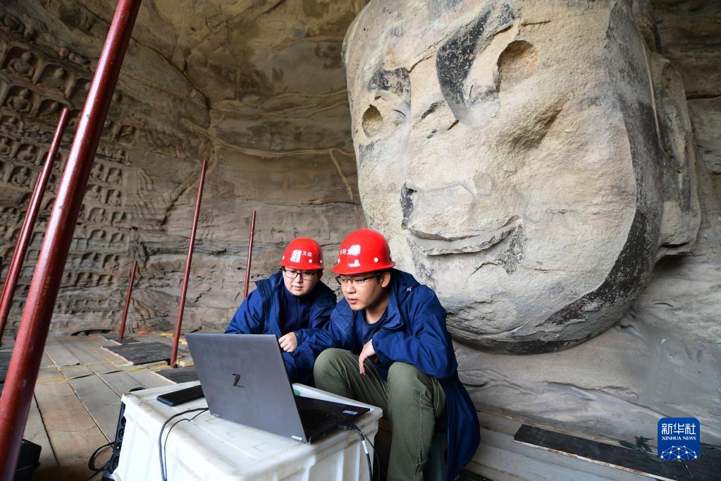 5月11日,在云岡石窟第17窟,工作人員在分析采集到的石窟數(shù)據(jù)信息。新華社記者 楊晨光 攝