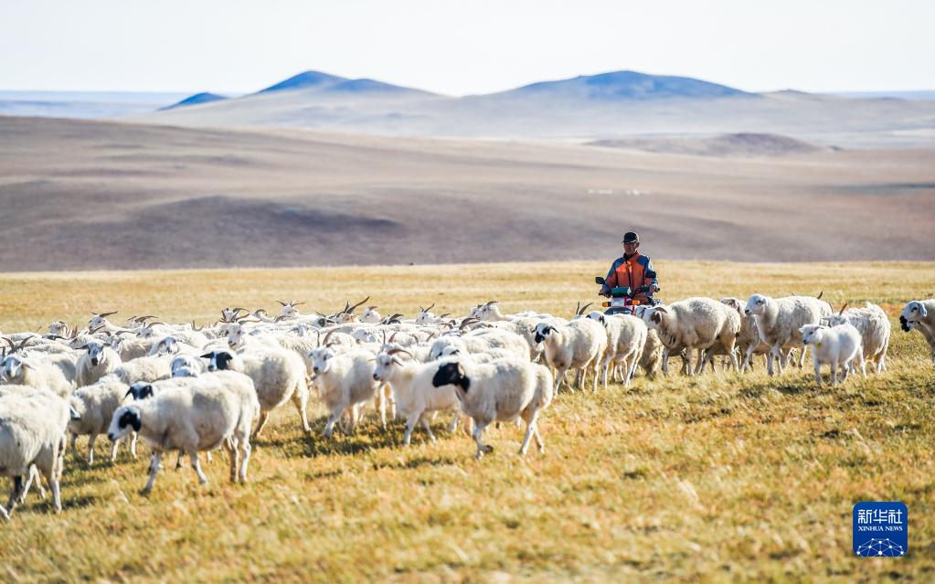 內(nèi)蒙古錫林浩特市寶力根蘇木牧民瑪吉格的兒子鋼蘇格拉在草原上放羊(2017年9月16日攝)。新華社記者 連振 攝