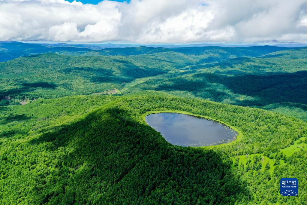 這是內(nèi)蒙古阿爾山天池風(fēng)光(2021年7月14日攝,無人機(jī)照片)。新華社記者 連振 攝