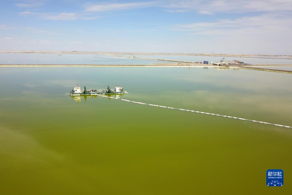 這是2022年6月13日在青海柴達(dá)木盆地拍攝的察爾汗鹽湖上的采鹽船(無人機(jī)照片)。新華社記者 范培珅 攝
