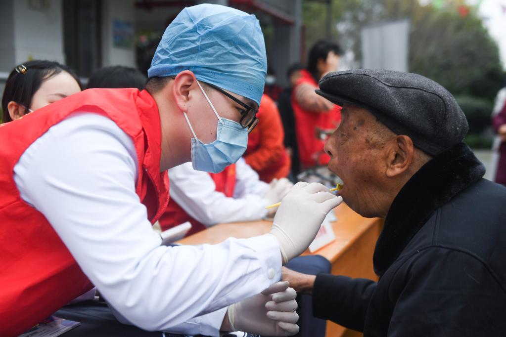 2022年3月4日,在浙江余姚市臨山鎮(zhèn)敬老院,志愿者在給老人檢查口腔。新華社記者 徐昱 攝