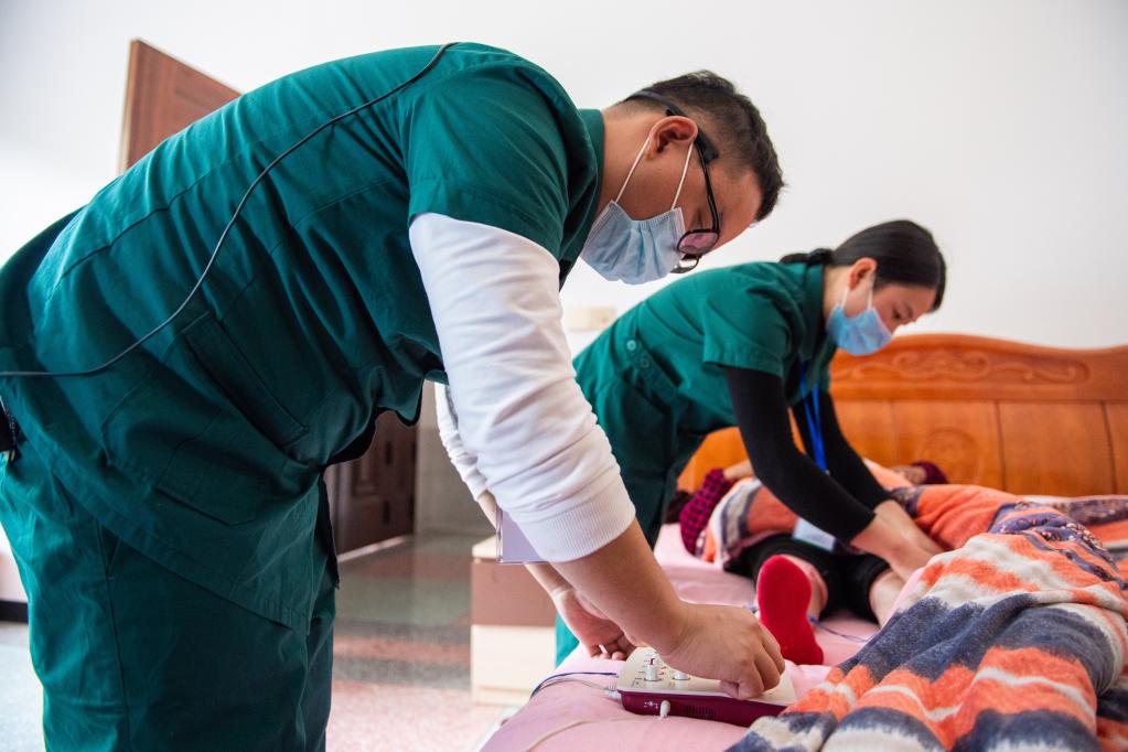 2021年11月12日,在湖南省長沙市長沙縣果園鎮(zhèn)楊泗廟社區(qū),醫(yī)務(wù)人員彭永(左)、劉敏給居家老人做理療。新華社記者 陳思汗 攝