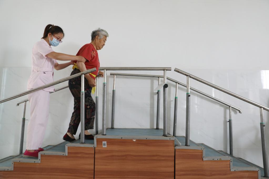 2021年7月3日,在河南省焦作市溫縣養(yǎng)老護理院醫(yī)養(yǎng)中心,一名醫(yī)護人員幫助一名老人進行康復(fù)訓(xùn)練。新華社發(fā)(徐宏星 攝)