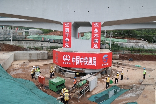 據(jù)悉,由中鐵四局承建的澠淅高速跨浩吉鐵路轉(zhuǎn)體梁全長(zhǎng)140米,橋面寬13米,主墩高5米,是澠淅高速的控制性工程之一。該轉(zhuǎn)體梁是國(guó)內(nèi)為數(shù)不多的雙幅跨鐵路曲線梁,且距離鐵路線僅有8米,施工難度大,安全隱患多,安全卡控要求嚴(yán)。為實(shí)現(xiàn)精準(zhǔn)對(duì)接,項(xiàng)目部分別在2個(gè)T構(gòu)主墩安裝千斤頂和液壓泵,同步順時(shí)針轉(zhuǎn)體44.5°和42.3°。在歷經(jīng)正常轉(zhuǎn)動(dòng)、減速轉(zhuǎn)動(dòng)、點(diǎn)動(dòng)轉(zhuǎn)動(dòng)三個(gè)階段后,歷時(shí)100分鐘精確完成轉(zhuǎn)體。