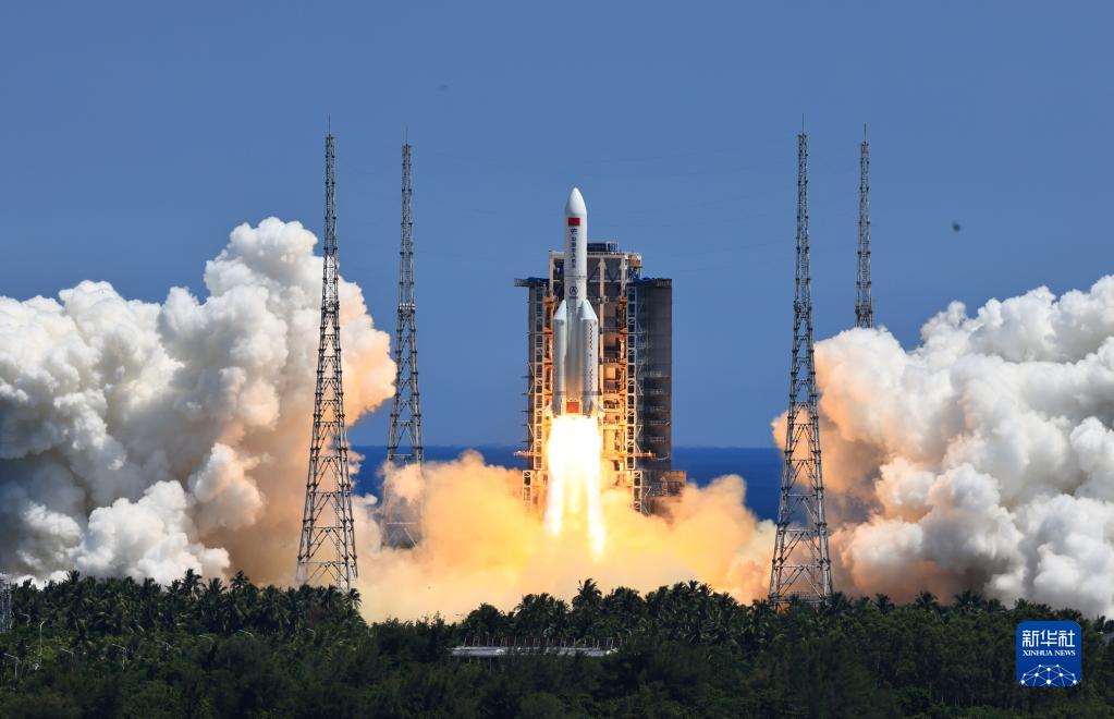 搭載問天實驗艙的長征五號B遙三運(yùn)載火箭,在我國文昌航天發(fā)射場點火發(fā)射(2022年7月24日攝)。新華社記者 李剛 攝