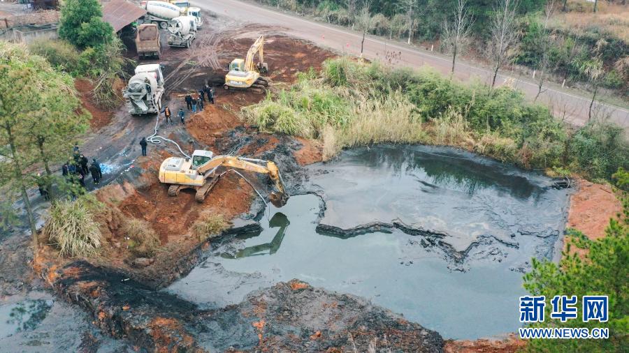 1月7日,在湖南省茶陵縣洣江街道諸睦村和建礦業(yè)有限公司,茶陵縣多部門(mén)工作人員在抓緊清理尾礦庫(kù)的廢水和淤泥(無(wú)人機(jī)照片)。 新華社發(fā)
