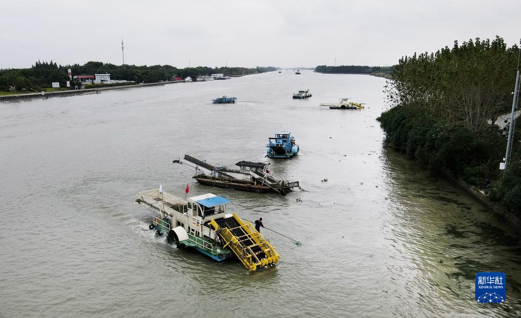 蘇浙滬三地的保潔船在太浦河水域聯(lián)合清理水面浮游植物(2020年10月15日攝,無人機(jī)照片)。當(dāng)日,來自蘇州市吳江區(qū)、上海市青浦區(qū)和嘉興市嘉善縣的三名河長在位于長三角生態(tài)綠色一體化發(fā)展示范區(qū)的蘇浙滬交界水域太浦河流域附近開展聯(lián)合巡河活動。新華社記者 方喆 攝