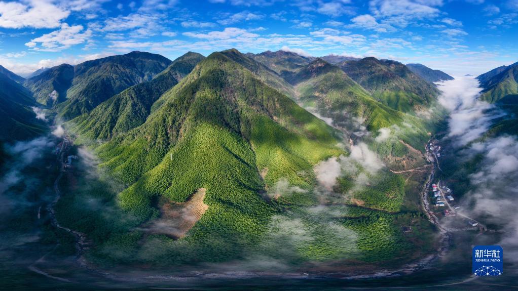 武夷山國家公園武夷斷裂帶峽谷內(nèi)云霧繚繞,村莊若隱若現(xiàn)(2020年12月1日攝,無人機(jī)照片)。新華社記者 姜克紅 攝