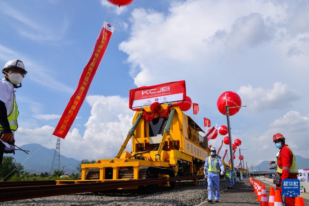 工作人員在印度尼西亞萬隆雅萬高鐵鋪軌施工現場作業(yè)(2022年4月20日攝)。新華社記者 徐欽 攝