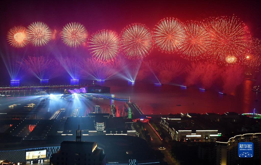 這是在青島舉行的《有朋自遠方來》燈光焰火藝術表演(2018年6月9日晚攝)。2018年6月9日至10日,上海合作組織成員國元首理事會第十八次會議在青島召開。新華社記者 李紫恒 攝