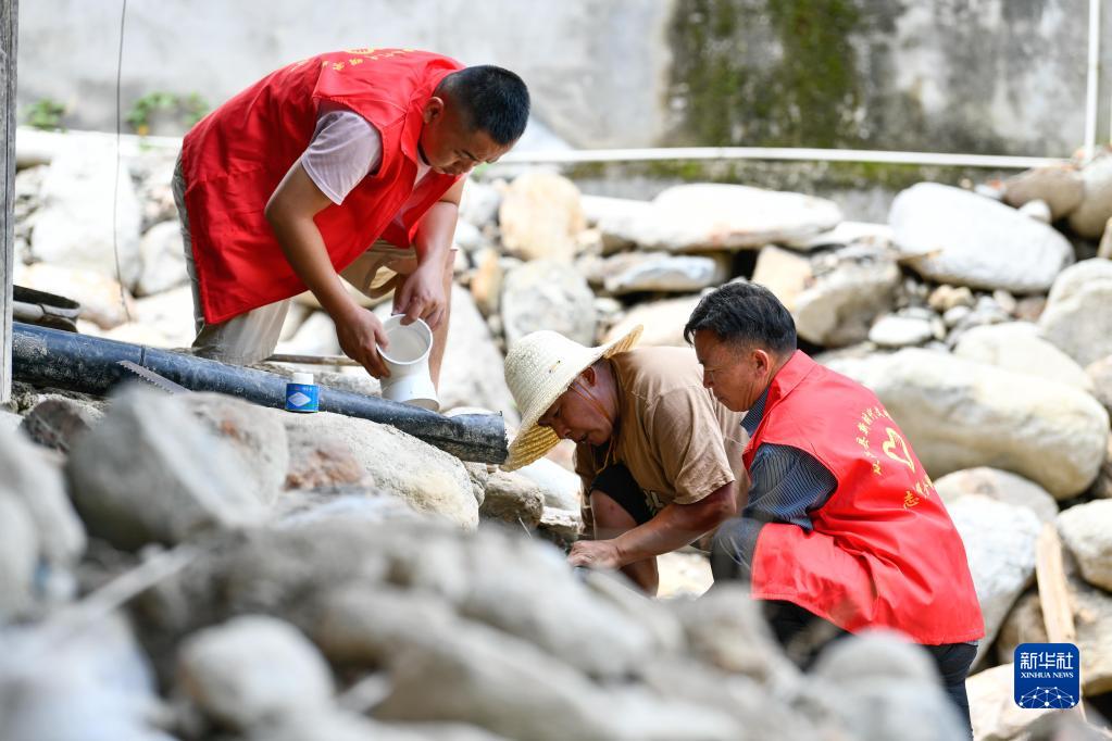 在貴州省黔東南苗族侗族自治州從江縣剛邊壯族鄉(xiāng)銀平村,黨員志愿者幫助遭受強(qiáng)降雨襲擊受災(zāi)的村民修整水管(2022年7月1日攝)。新華社記者 楊文斌 攝