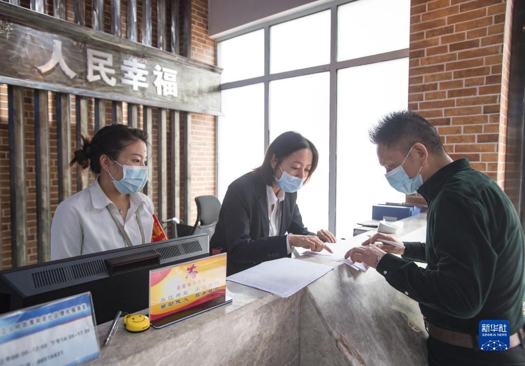 2020年9月18日,湖北省武漢市青和居社區(qū)服務(wù)中心工作人員協(xié)助社區(qū)居民填寫(xiě)材料。新華社記者 肖藝九 攝