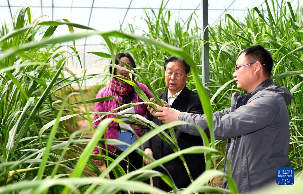 菌草專家林占熺(中)在寧夏銀川市永寧縣閩寧鎮(zhèn)農戶劉昌富的大棚里查看菌草生長情況(2021年3月29日攝)。新華社記者 王鵬 攝