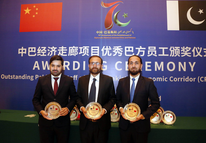 2021年12月29日,優(yōu)秀員工代表在巴基斯坦伊斯蘭堡舉行的中巴經(jīng)濟(jì)走廊項目優(yōu)秀巴基斯坦員工頒獎儀式上合影。