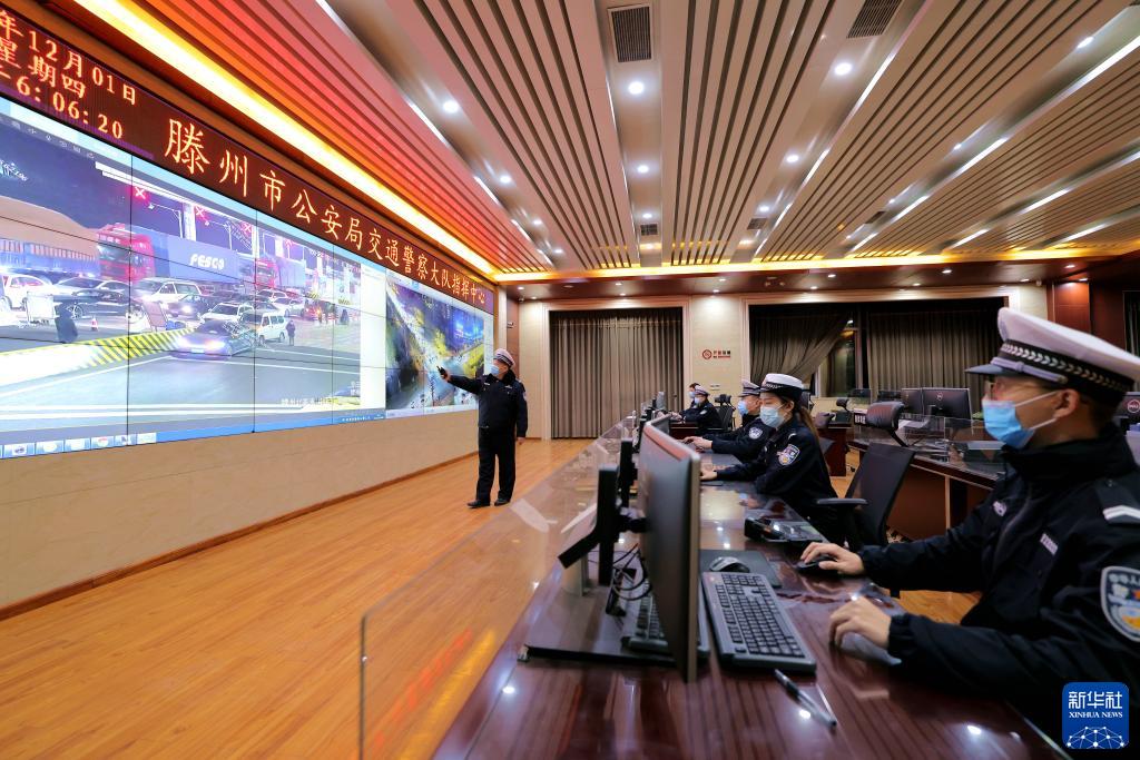 12月1日,在山東省滕州市公安局交警大隊指揮中心,借助“情、指、勤、督”一體化智慧交通管理平臺,民警對各個路口及路段交通流數(shù)據(jù)進(jìn)行綜合分析。新華社發(fā)(鐘自增 攝)