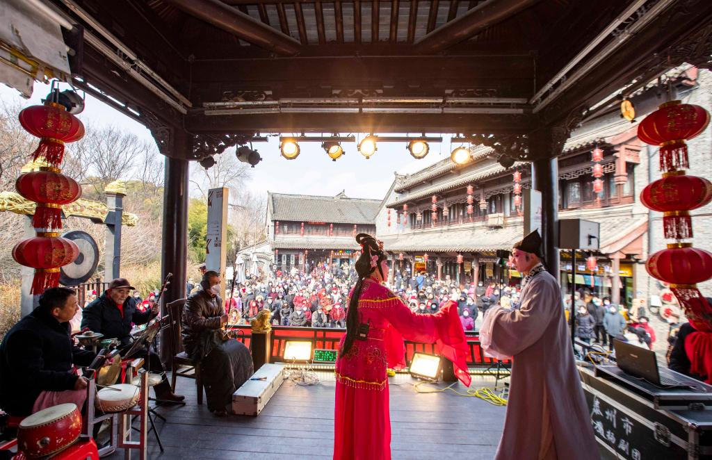 1月24日,江蘇省泰州市海陵區(qū)小鷹揚(yáng)劇團(tuán)在泰州老街古戲臺(tái)表演揚(yáng)劇《珍珠塔·贈(zèng)塔》選段。新華社發(fā)(湯德宏 攝)