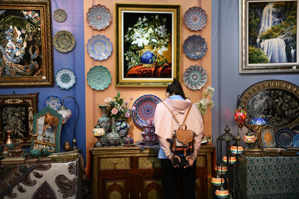 2021年9月12日,在廣西南寧國際會展中心,參觀者在東博會“一帶一路”國際展區(qū)伊朗展臺觀看展品。