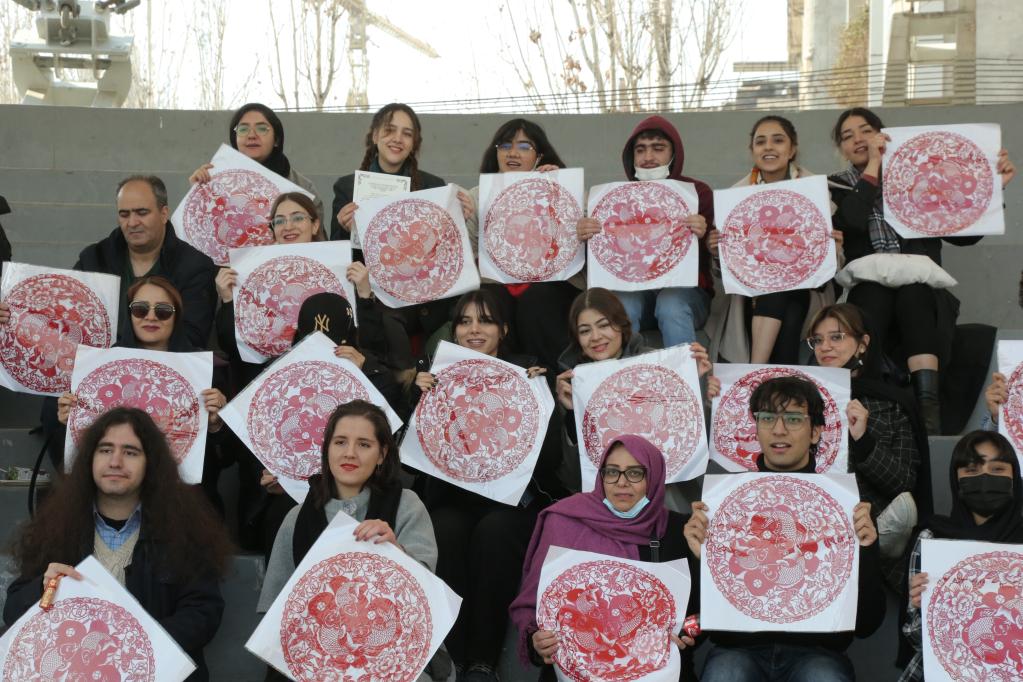 1月18日,伊朗青年學生在伊朗首都德黑蘭的一處公園展示中國春節(jié)裝飾品。當日,伊朗德黑蘭大學孔子學院組織青年學生與中方教師一起學習傳統(tǒng)年俗、體驗中國文化,共同迎接春節(jié)到來。